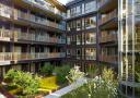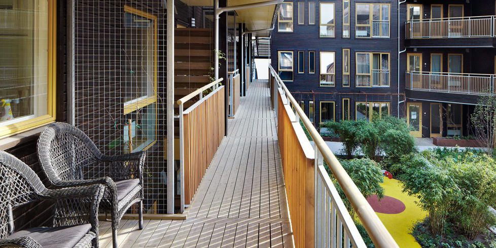 FELLESAREAL: Fløyene hegner om et felles gårdsrom. Ifølge arkitektene er dette viktig i et nabolag som er dominert av ikke-boligrelaterte funksjoner, som småindustri og kontor. Foto: Ivan Brodey