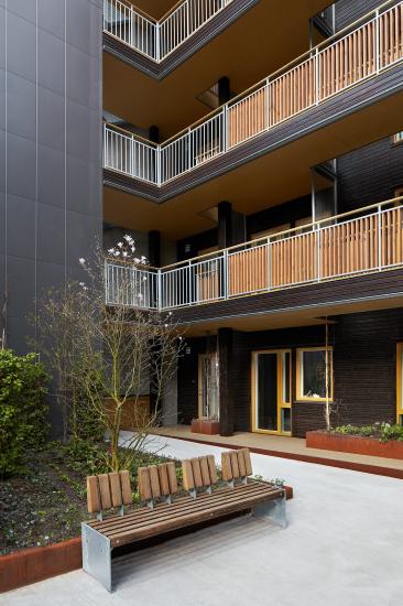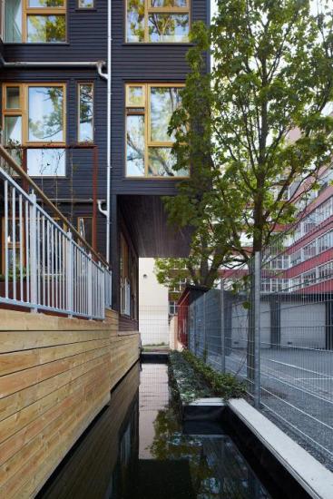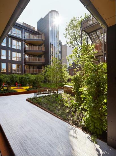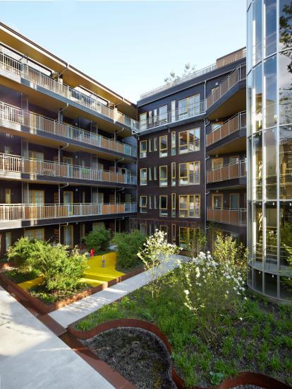 Fløyene hegner om et felles gårdsrom. Dette er viktig i et nabolag som er dominert av ikke-boligrelaterte funksjoner, som småindustri og kontor. Leilighetene er av ulik størrelse fra 40-75 kvadratmeter. Gårdsrommet er cirka 500 kvm. To takterrasser, små private uteplasser samt inndeling i ulike områder ved hjelp av beplantning og ulike belegg, bidrar til å gjøre utearealene innholdsrike.